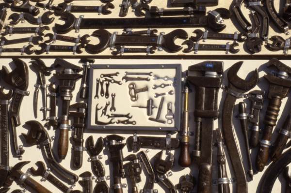 The small case in the center holds the smallest wrenches of the collection, including several from Meccano construction sets.